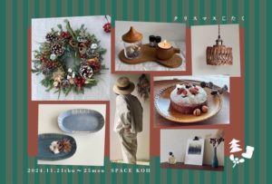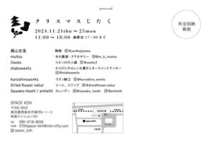 11 012024 クリスマスじたく展のお知らせ 今年も、西武柳沢のギャラリー「SPACE KOH」さんにて開催される「クリスマスじたく」展に参加します。ぜひお誘いあわせの上、お出かけください。 (株)東京堂さま 制作動画のお知らせ・2 前の記事 (株)櫻建設さま パーティー装花のご紹介 次の記事